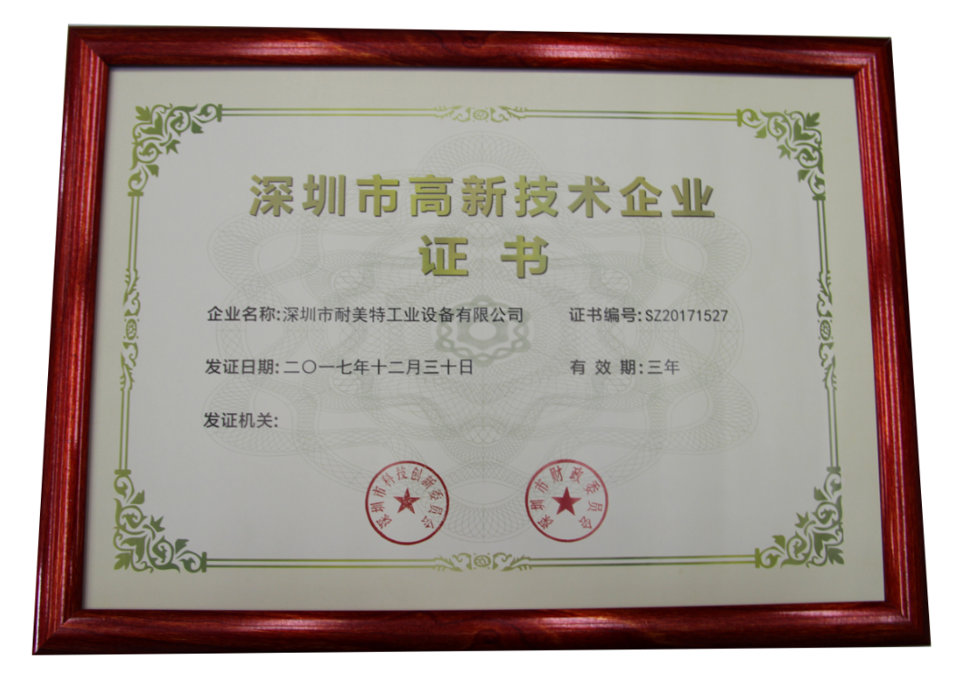 2018年伊始,深圳耐美特工業設備有限公司喜迎佳音——根據國家《高新技術企業認定管理辦法》和《高新技術企業認定管理工作指引》的相關規定,耐美特工業設備被認定為國家級高新技術企業。近日,公司也已收到了由深圳市科技創新委員會、深圳市財政委員會、深圳市國家稅務局、深圳市地方稅務局聯合頒發的“國家高新技術企業”認定證書,由此正式邁入國家高新技術企業行列。