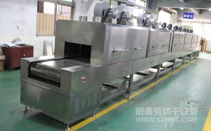 2、外形尺寸(約):總長14000mm*總高1490mm*總寬1040mm,地面到網(wǎng)帶的高度為850mm,產(chǎn)品傳送帶寬度為600mm,爐體內(nèi)進(jìn)料高度為300mm;烘干部分總長7500mm,分4段,第一段長1500mm,后三段各長2000mm, 冷卻部分長4000mm,分2段,每段2000mm,爐蓋上加裝0.75KW強力離心風(fēng)機,爐體底部加裝收風(fēng)斗(鍍鋅板烤漆),兩端緩沖部分各長400mm, 緩沖區(qū)進(jìn)料高度為200mm,各加手動調(diào)節(jié)門,進(jìn)料部分長850mm,出料部分長850mm , 爐體前后裝有急停開關(guān)。
